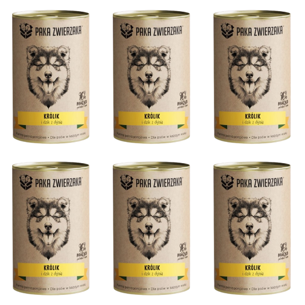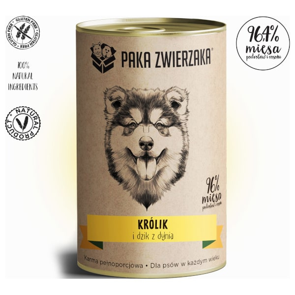 Karma Paka zwierzaka to kompletny i zbilansowany posiłek mokry bez zbóż, konserwantów, sztucznych barwników i wypełniaczy. Nadaje się dla psów wszystkich ras i każdym wieku. Naturalny, bogaty w składniki odżywcze i wysoko przyswajalne źródła białka zwierzęcego skład, przygotowany jest z najwyższej jakości świeżego mięsa i podrobów. Zawiera 98% królika z rosołem i dzika, co zapewnia wysokie walory smakowe, oraz strawność na równie wysokim poziomie. Paka zwierzaka zadowoli nawet wybredne psy. W składzie znajdziemy nowozelandzką małże zieloną, cenny składnik z właściwościami prozdrowotnymi. Małża ta bogata jest w glukozaminę i chondroitynę potrzebne dla wzmocnienia stawów. Dynia bogata jest w witaminy A, C, E, K i z grupy B, oraz składniki mineralne takie jak cynk, magnez, kwas foliowy, potas. To także doskonałe źródło włókna pokarmowego o właściwościach prebiotycznych.