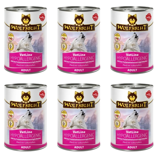 Wolfsblut VetLine HYPOALLERGENIC to specjalna pełnoporcjowa karma przeznaczona do stosowania przy nietolerancjach pokarmowych i alergiach. Aby zmniejszyć objawy nietolerancji surowców i składników odżywczych, Wolfsblut VetLine zawiera hipoalergiczną koninę jako wybrane źródło białka o niskim potencjale alergizującym. Dzięki temu idealnie nadaje się na dietę eliminacyjną. Ponadto unika się zbóż, aby zapewnić psom wrażliwym żywieniowo dietę odpowiednią dla gatunku. Zawarte w karmie niezbędne nienasycone kwasy tłuszczowe hamują reakcje zapalne i dlatego mogą zmniejszać objawy nietolerancji lub alergii.