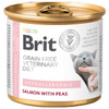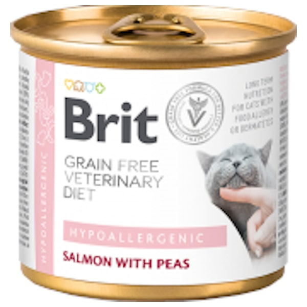 Brit Grain Free Veterinary Diets cat hypoallergenic to zbilansowana karma dietetyczna na obniżenie nietolerancji na składniki i substancje odżywcze. Karma polecana dla kotów z problemami żołątkowo-jelitowimi i dermatologicznymi wynikającymi z niepożądanej reakcji na pokarm. Pomaga w terapii schorzeń dermatologicznych (alergie, atopia i zapalenie ucha). Zaleca się użycie karmy przy przewlekłej biegunce i nieswoistym zapaleniu jelit.