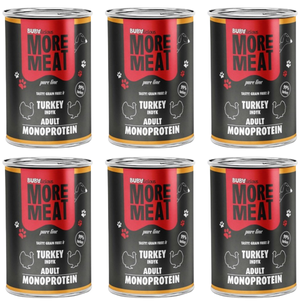 Zapewnij swojemu czworonogowi naturalną i zdrową dietę z karmą BUBAlicious More Meat Mono Pure Indyk. Ta wysokiej jakości karma w 100% oparta na jednym źródle mięsa – delikatnym i smakowitym indyku – stanowi idealne rozwiązanie dla psów z wrażliwym układem pokarmowym lub alergiami.