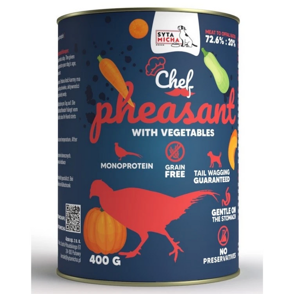Kompletna i smakowita mokra karma dla psa, stworzona z myślą o najbardziej wymagających czworonogach. Syta Micha Chef Bażant z warzywami to doskonałe połączenie delikatnego mięsa bażanta z bogactwem świeżych warzyw, które dostarczają niezbędnych witamin i minerałów. Idealna dla psów w każdym wieku, wspierająca zdrowie, energię i dobre samopoczucie.